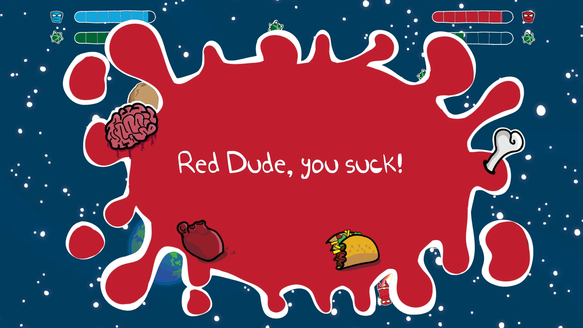Two hot-headed superhero trainees were fighting over a half-eaten taco using their superhuman strength. The League of Blub intervened and, in their unusual way of dealing with problems, decided to withdraw their superpowers and leave the two of them floating in space.