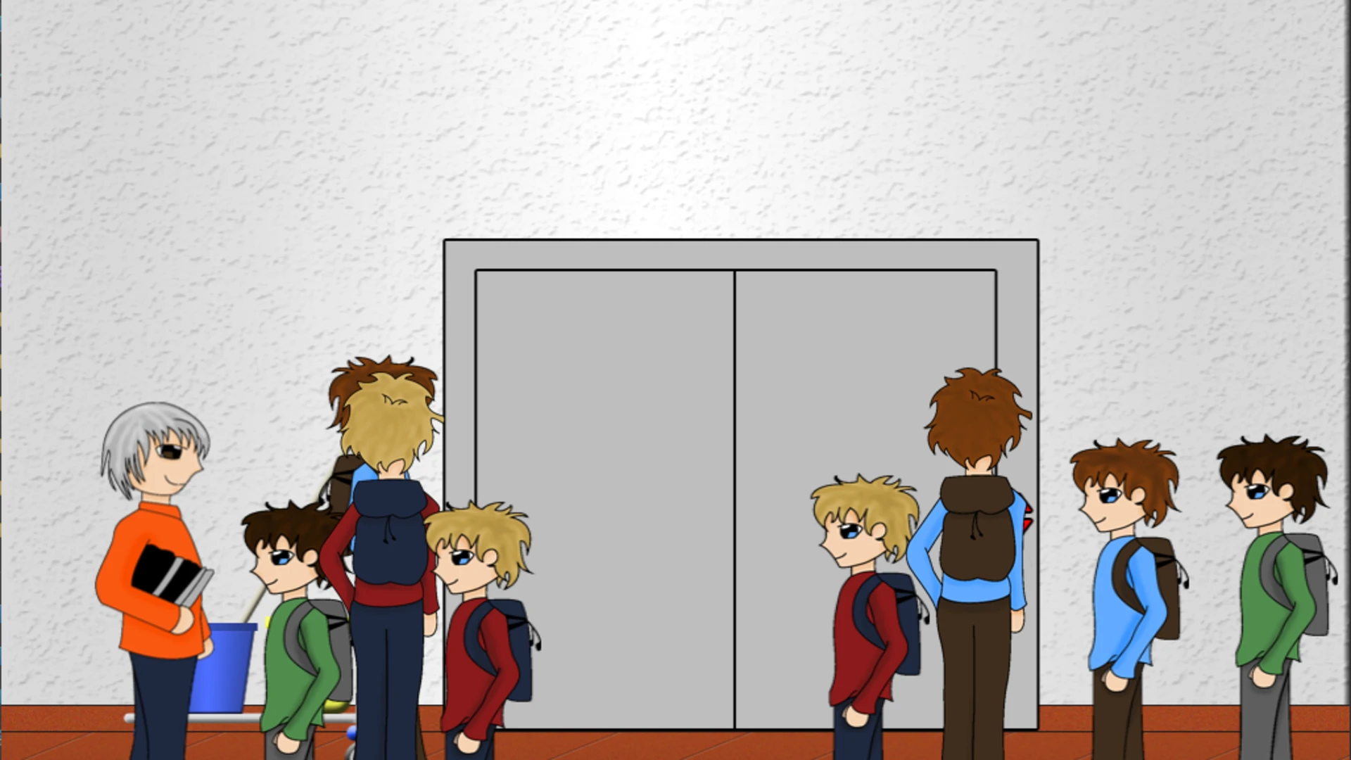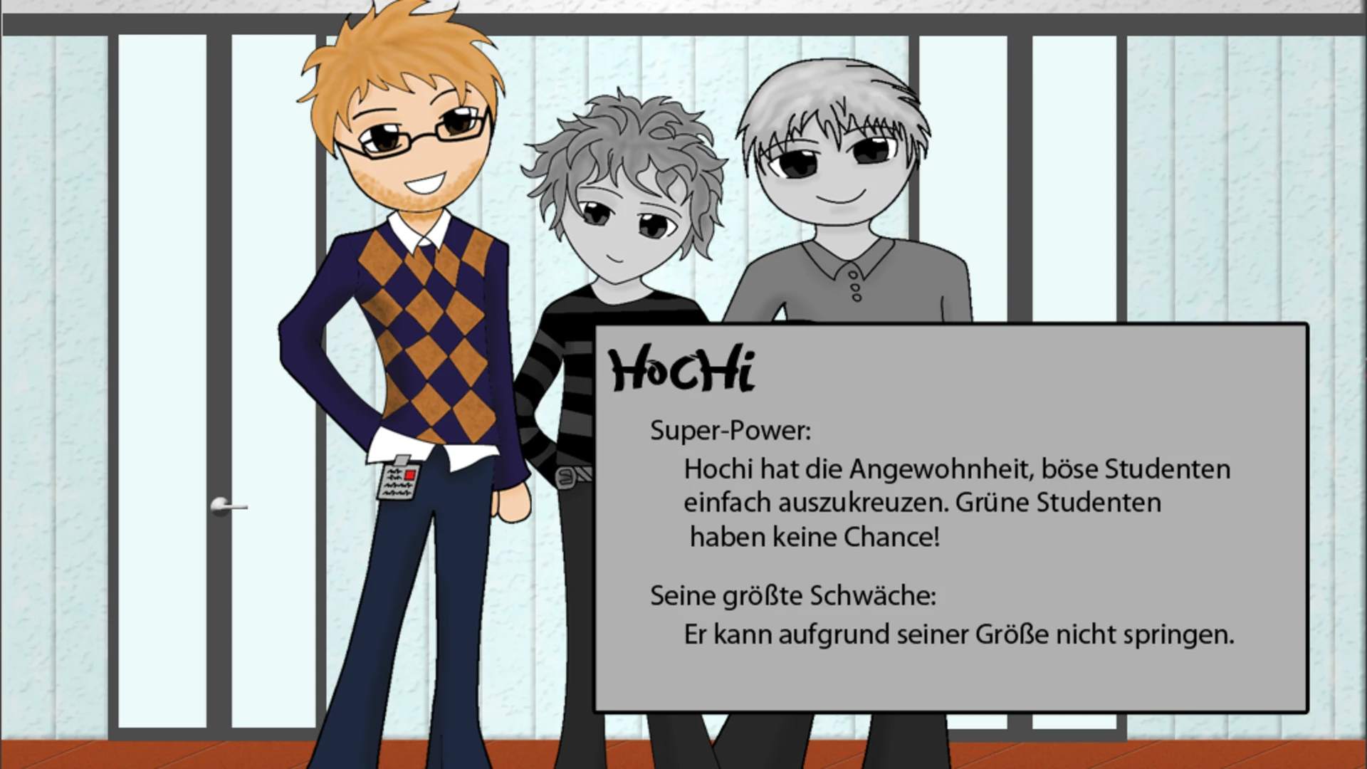 Students have stolen Wilbur's superpowers! Hochi, Schaufi, and Rudi have to make their way through the crowded halls of Hagenberg Campus to get them back. Cross out green students, with Hochi, send sound waves to red students, and put blue students to sleep with Rudi. Switch between your characters to proceed and fulfill Wilbur's task in time.