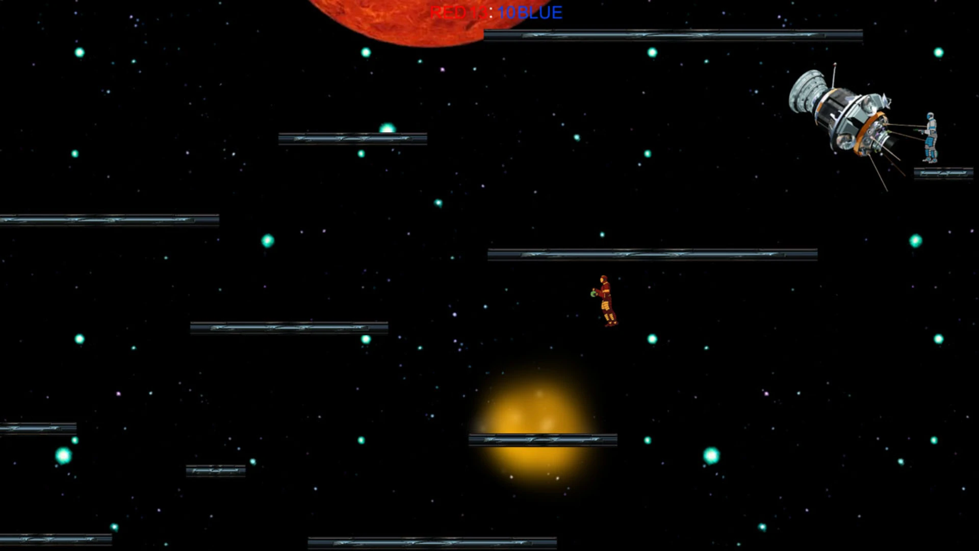 Player one starts as the hunter and player two is the hunted. The hunter starts with a laser gun and his prey has bombs to defend himself. With your weapon you can push your opponent off the platforms and win the round. But be careful- the bombs' detonation radius hurts both of you. Also, the roles change each round. If a player leaves the screen, he automatically forfeits the round and his opponent gets a point.