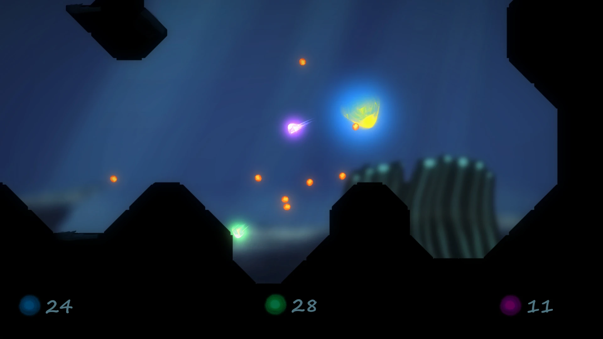 One out of three jellyfish has an infection. It has to touch another one to pass it on. The healthy jellyfish can collect the pickup boni spawned by the infected jellyfish to gain points. They can also bump into each other to create a wave that throws back the infected jellyfish. All jellyfish naturally attract each other and can further pull in boni by blinging up.