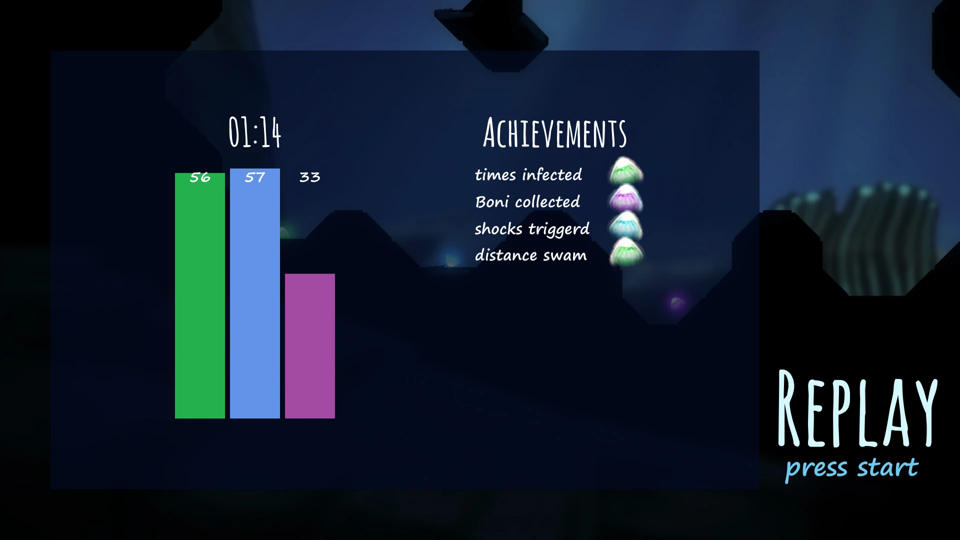 The goal is to collect as many points as possible. Points are gained from picking up bonus objects, hitting another healthy jellyfish or giving the infection to another jellyfish when infected.