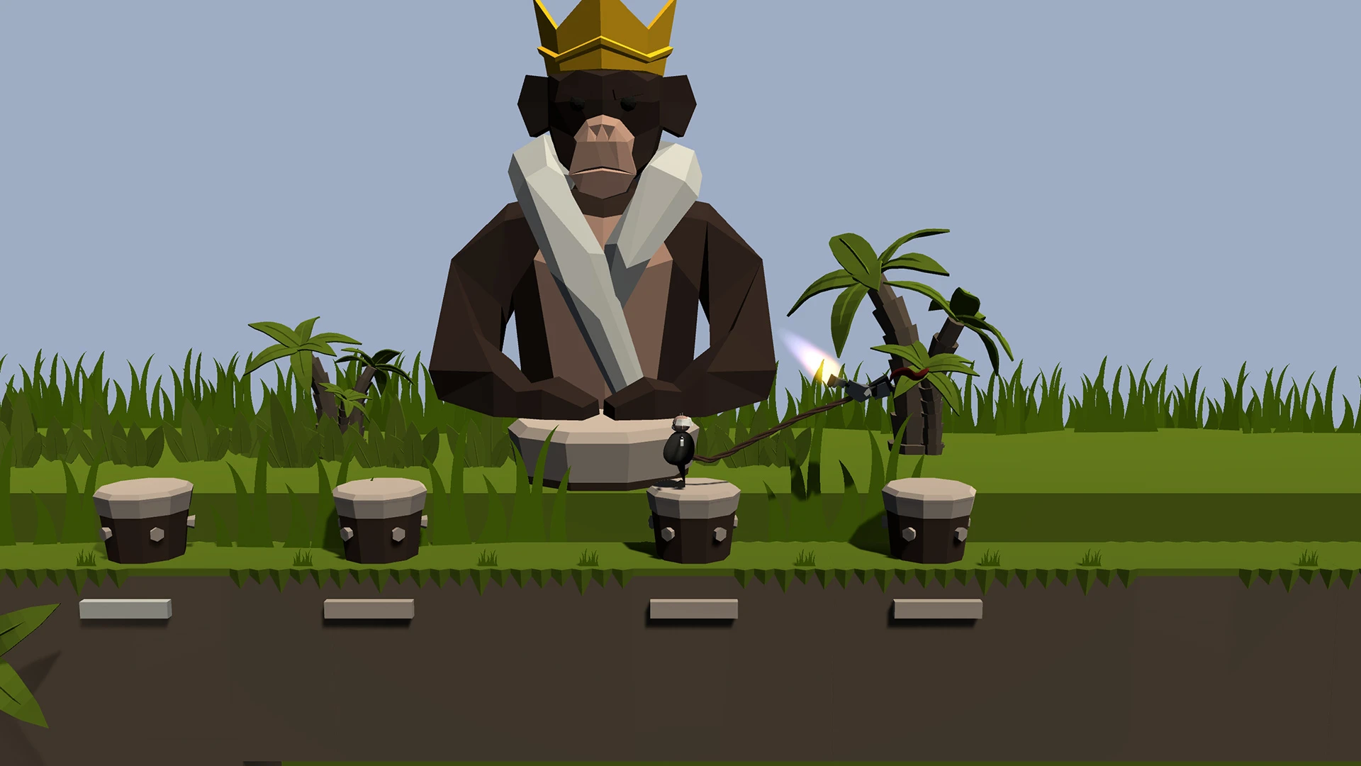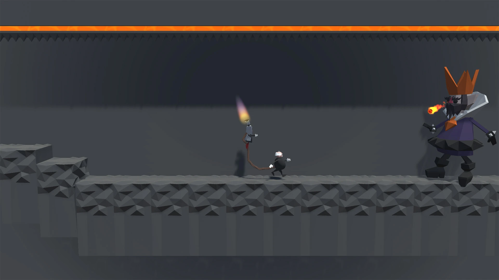 Control the butler and the hero tethered to him and reach the king using the hero's rocket boots and the butler's rope.