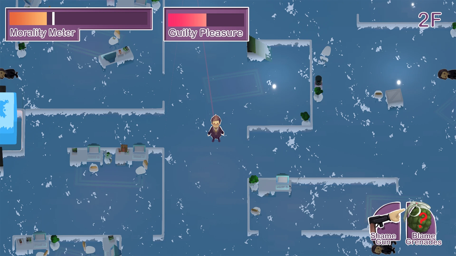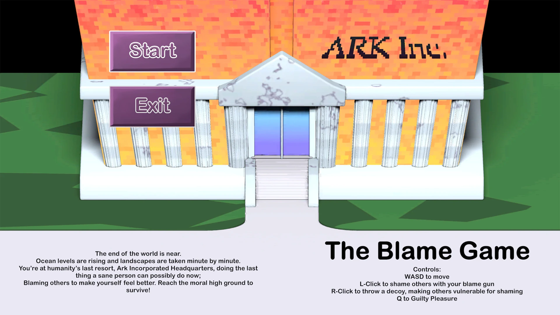 The end of the world is near. \nOcean levels are rising and landscapes are taken minute by minute. \nYou’re at humanity’s last resort, Ark Incorporated Headquarters, doing the last thing a sane person can possibly do now: blaming others to make yourself feel better. \nReach the moral high ground to survive!