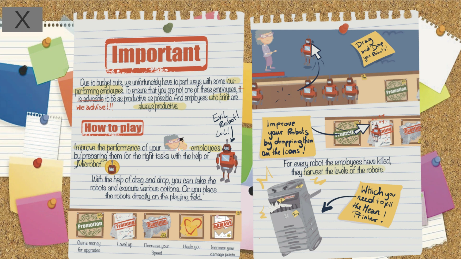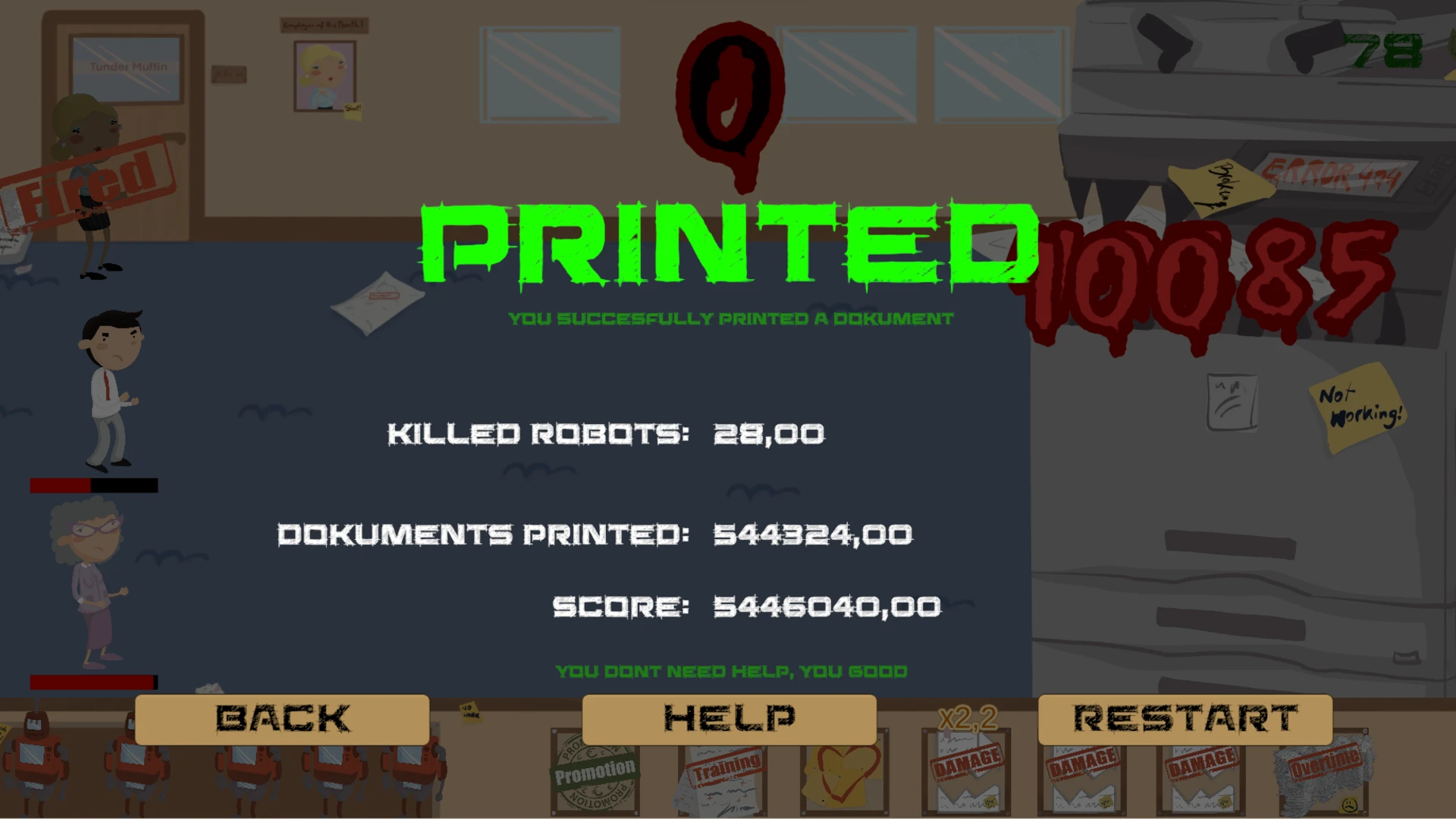 In the game 'Tunder Muffin GmbH,' you join three employees on their quest to avoid being fired. To boost productivity, they need to enhance their skills using small robots, ultimately aiming to defeat the ultimate office boss. The goal of this game is to level up the three employees by using helper robots, enabling them to defeat the final boss, the MEAN Printer. This auto-battle/strategy balance game not only tests players' strategic thinking but also demands quick decision-making and reflexes. When you kill a robot, the employee takes over the stats from the robot. Make them as strong as possible, but don't kill your own employees. A smart balance is important for a strong robot, but not too strong to kill one of the employees.