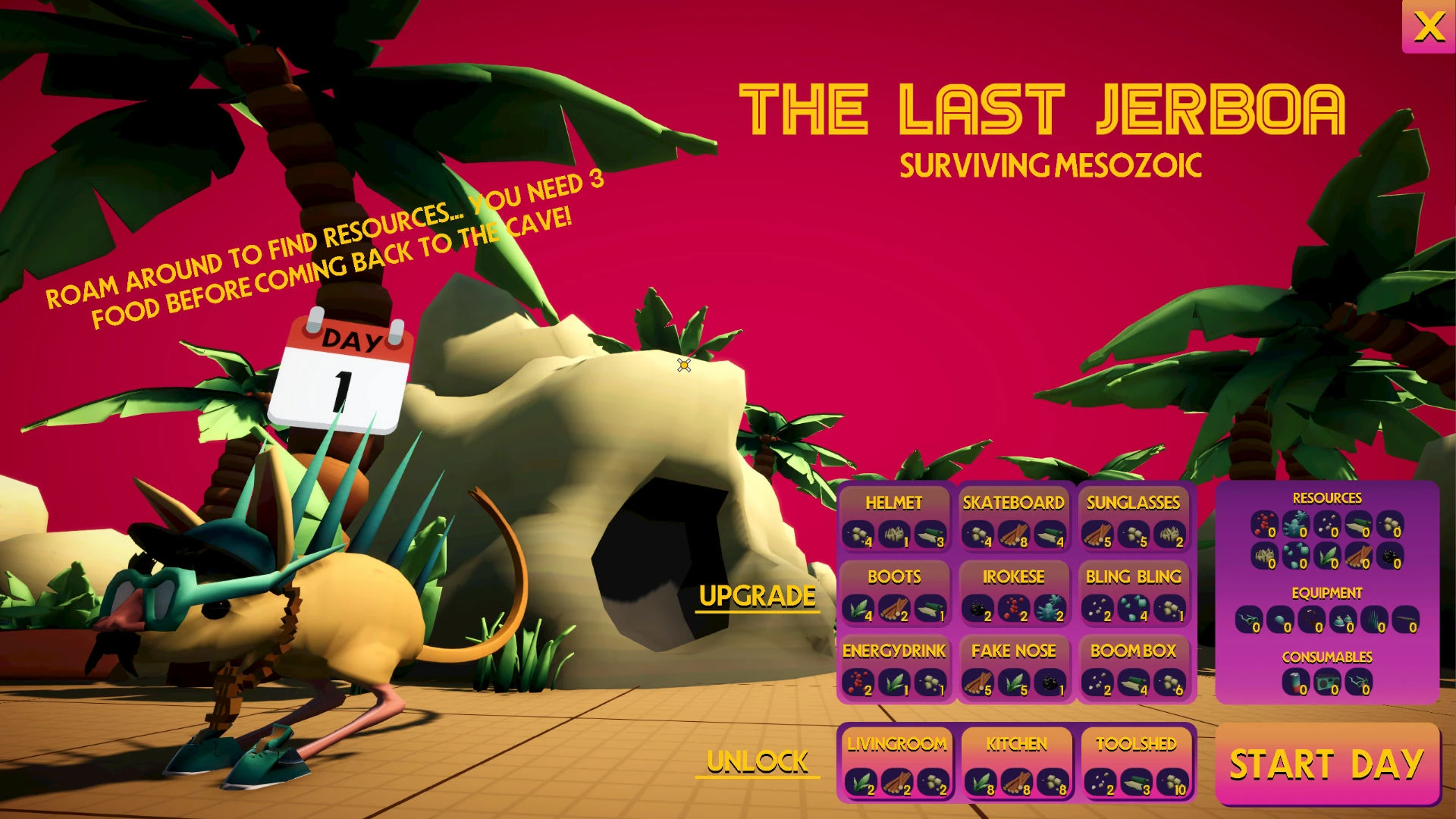 You are the last Jerboa! Get out in the Mesozoic age and try to survive the wilds. Gather food and other useful resources and return to your cave before the night appears. Back there, you can upgrade your safe place with crafting Rooms and make the life of your newborn Jerboa better than yours. Happy hoping, little mice!