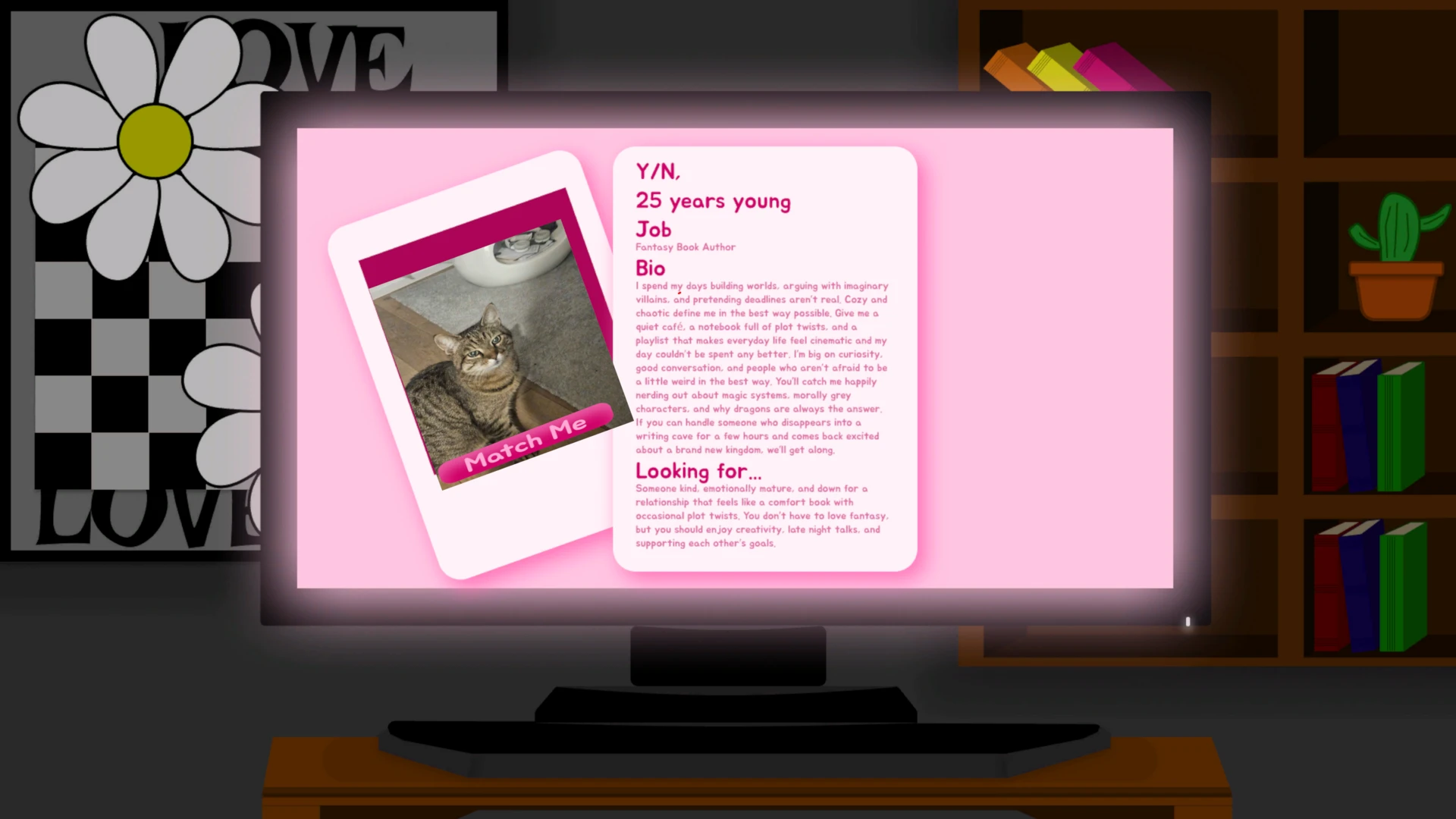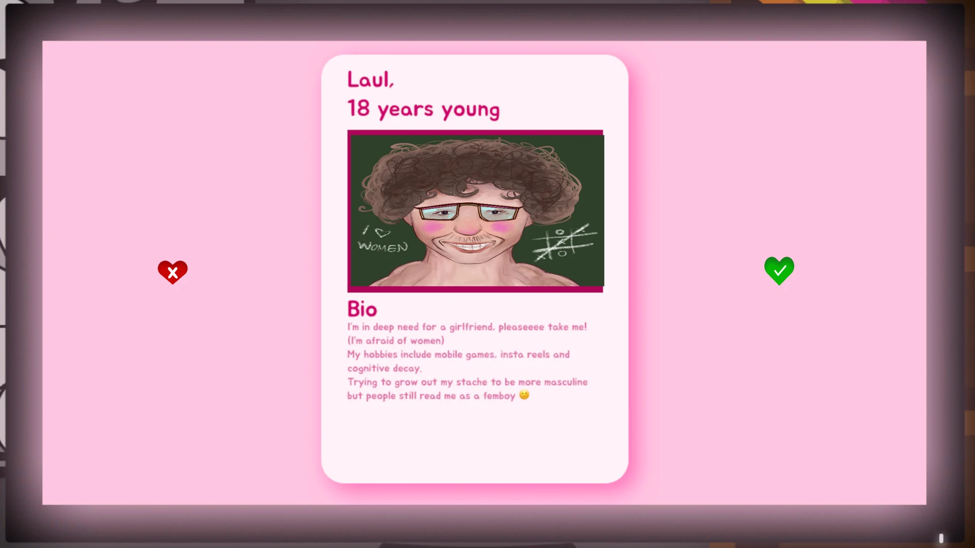 In this game, you try to date and rizz some people, but as the AI has skipped dating school, it suggests you make really hard choices. Your goal: to get as many dates as possible, and trust me, that ain't easy! Because you are a poor student, you only have the base version of the dating app "Humble". That's why you have to play some unskippable ads to burn your last brain cells before it's a match again.