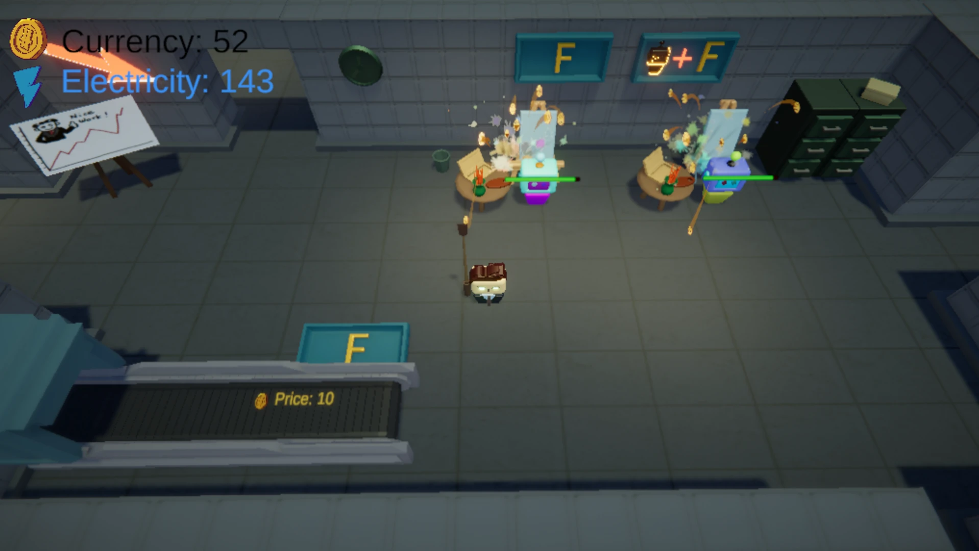 - Movement: WASD - Interact: F The player can interact with robots, task stations, task plots, and the conveyor belt.